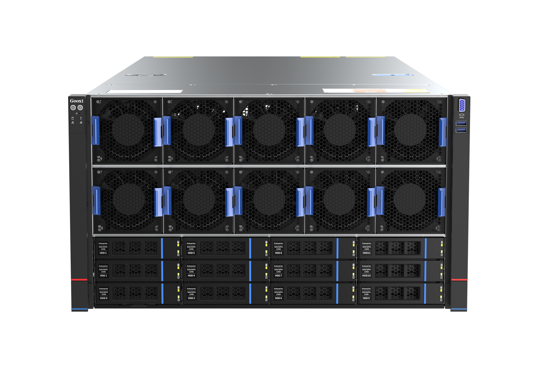 | I/O端口 | 前置端口:12个热插拔3.5/2.5" SAS/SATA/NVMe硬盘 后置端口:1个串口、2个USB 3.0接口、1个VGA、1个RJ45管理口(可选增配2个10G RJ45业务网口) |